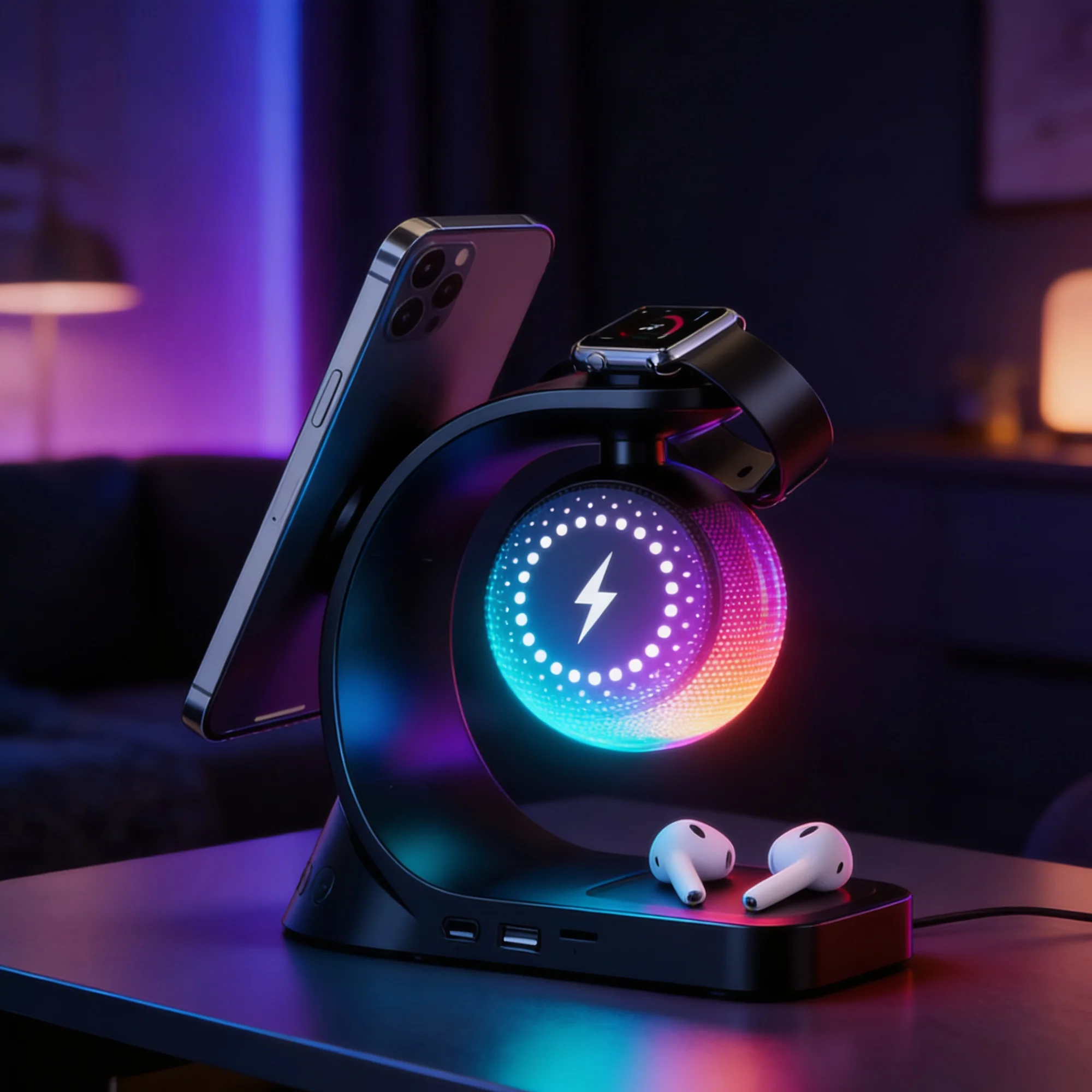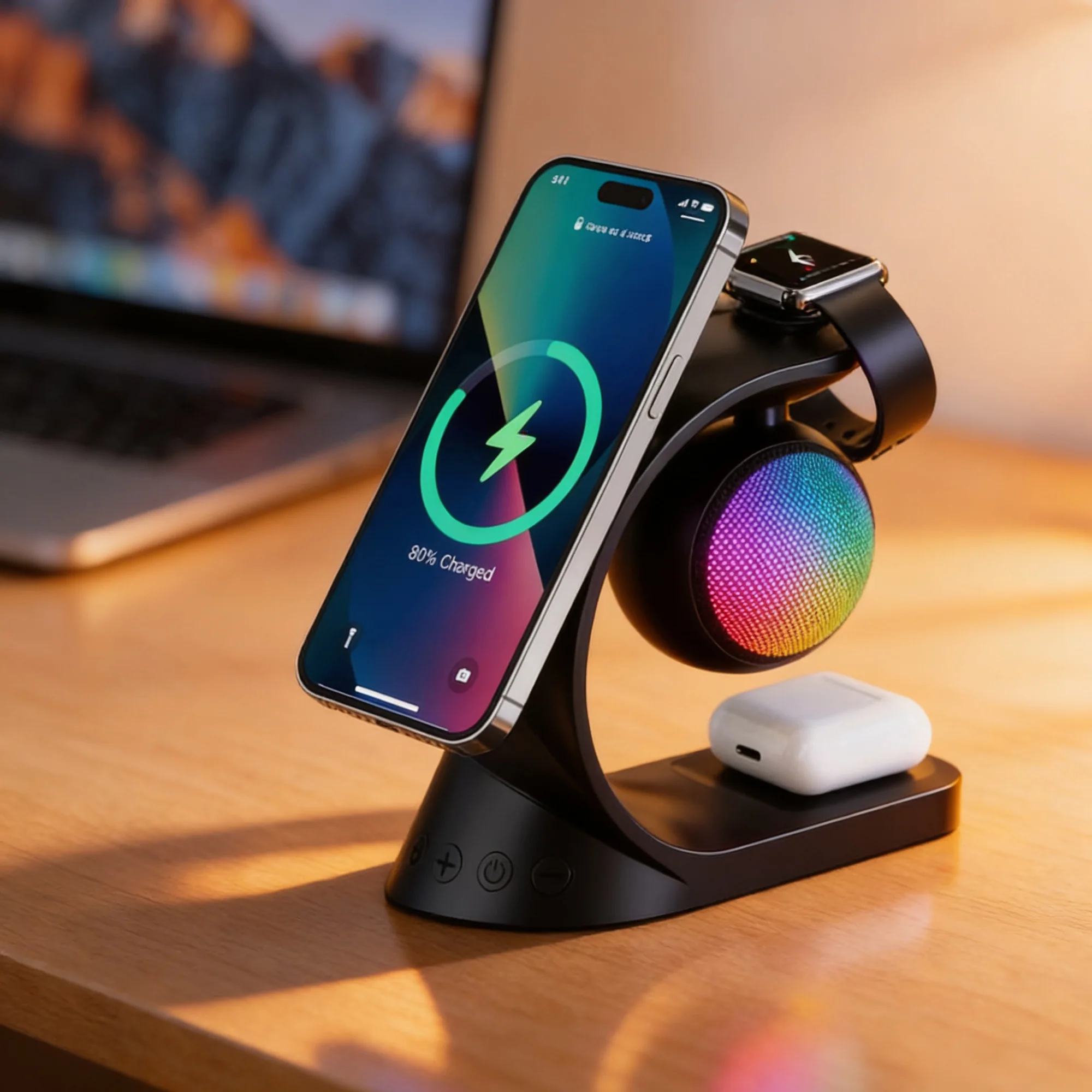 زاوية الشحن المتعدد: يشحن جوالك وسماعاتك وساعة أبل بنفس الوقت زاوية الشحن السريع: يدعم شحن لاسلكي سريع لجميع الأجهزة المتوافقة زاوية مكبر الصوت: يعطي صوت واضح وممتع أثناء الشحن